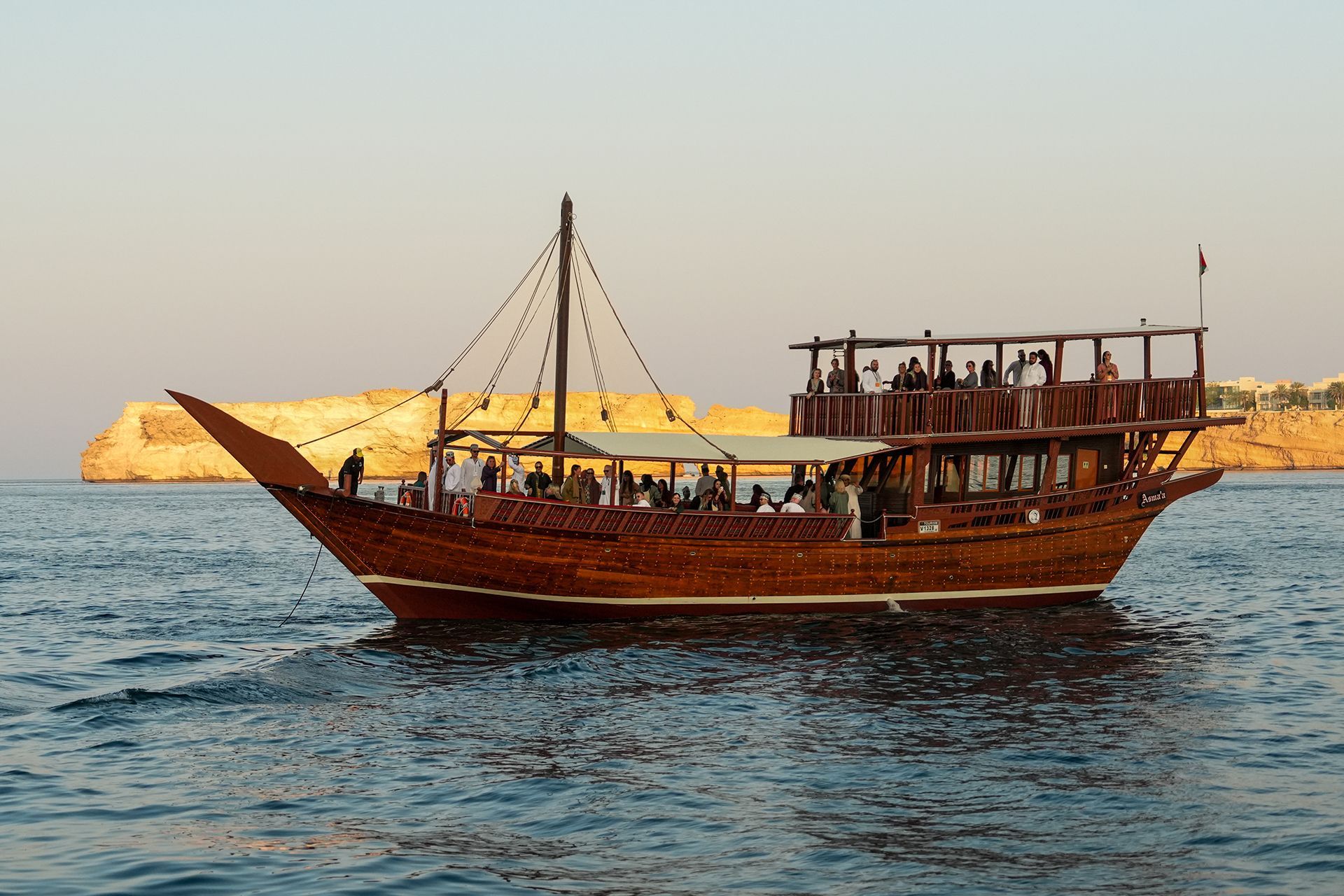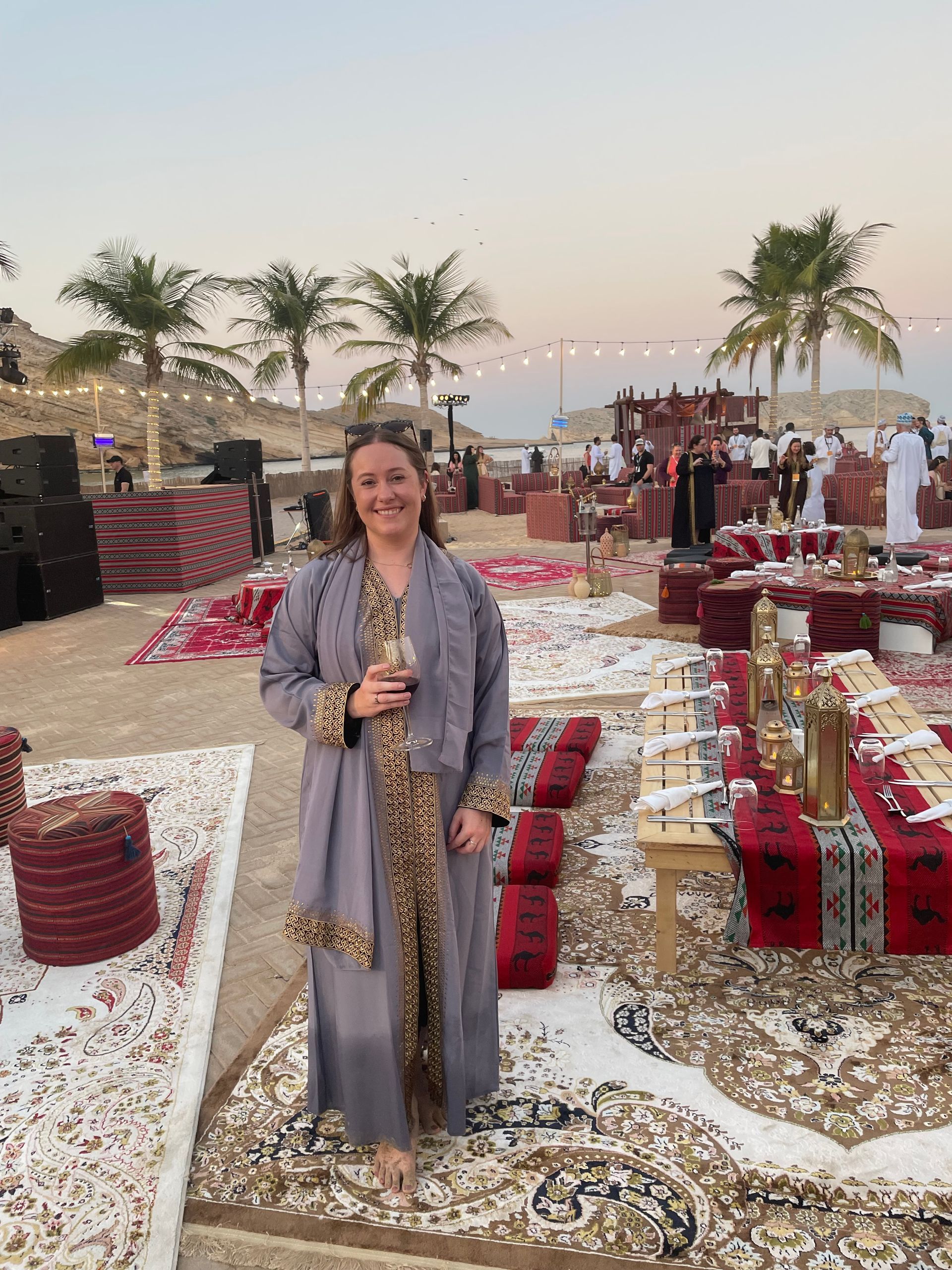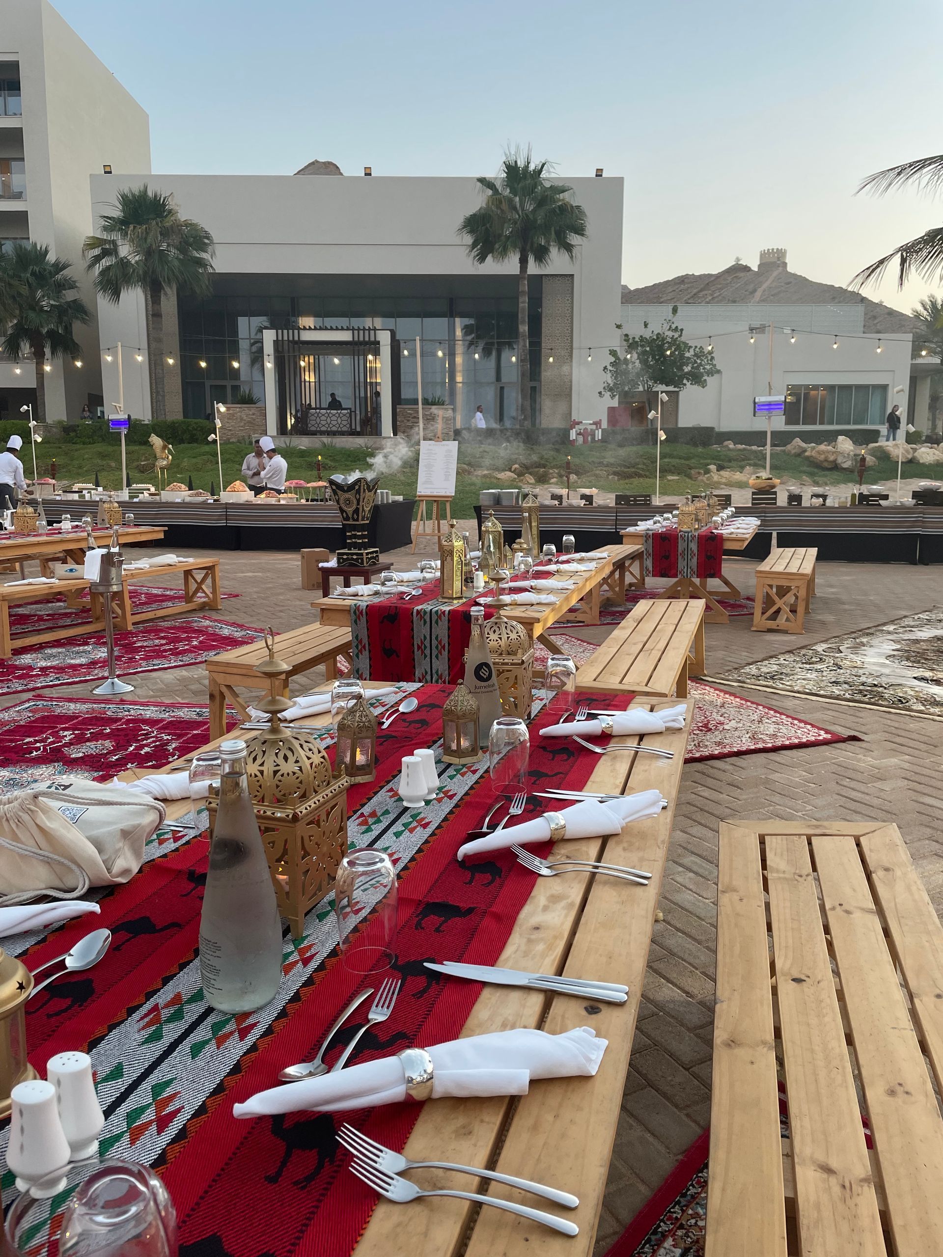 On the afternoon of day two, we were treated to a beautiful sunset Dhow cruise, dressed in our traditional Omani attire. Our journey took us to the stunning Jumeirah Muscat Bay, where we were welcomed to an unforgettable evening in an exquisite outdoor setting. Long wooden tables, traditional Arabian seating, towering palm trees swaying gently in the breeze, and an array of incredible dishes came together to create a truly spectacular experience.